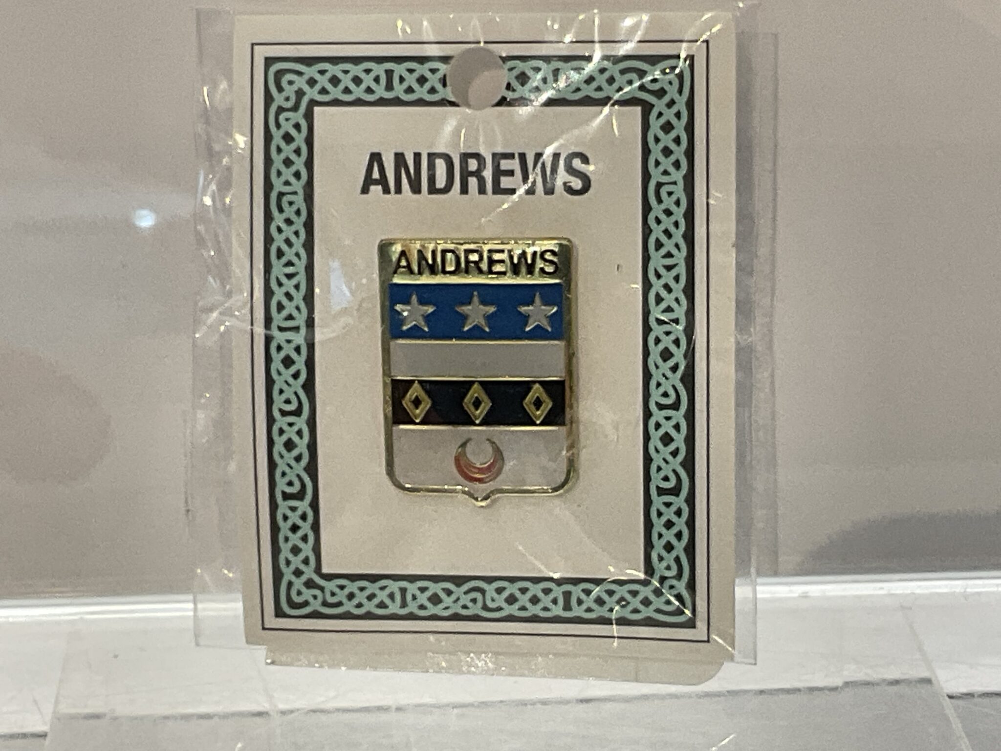 The Andrews Pinbadge doesn’t fit your family heritage? No problem! We carry a wide variety of family crests in pinbadges, keychains, coasters, and more. Feel free to contact the store if you do not see your family available.