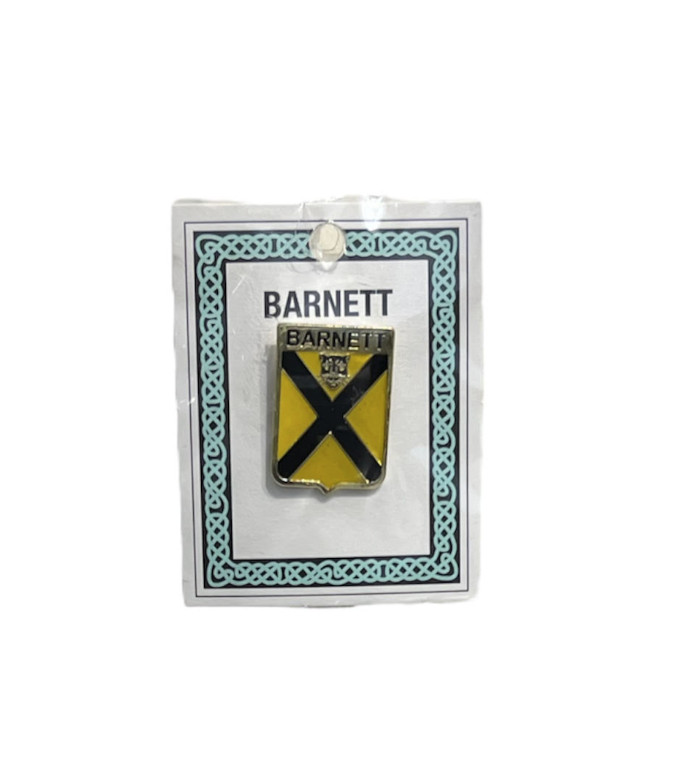 The Barnett Pinbadge doesn’t fit your family heritage? No problem! We carry a wide variety of family crests in pinbadges, keychains, coasters, and more. Feel free to contact the store if you do  not see your family available.