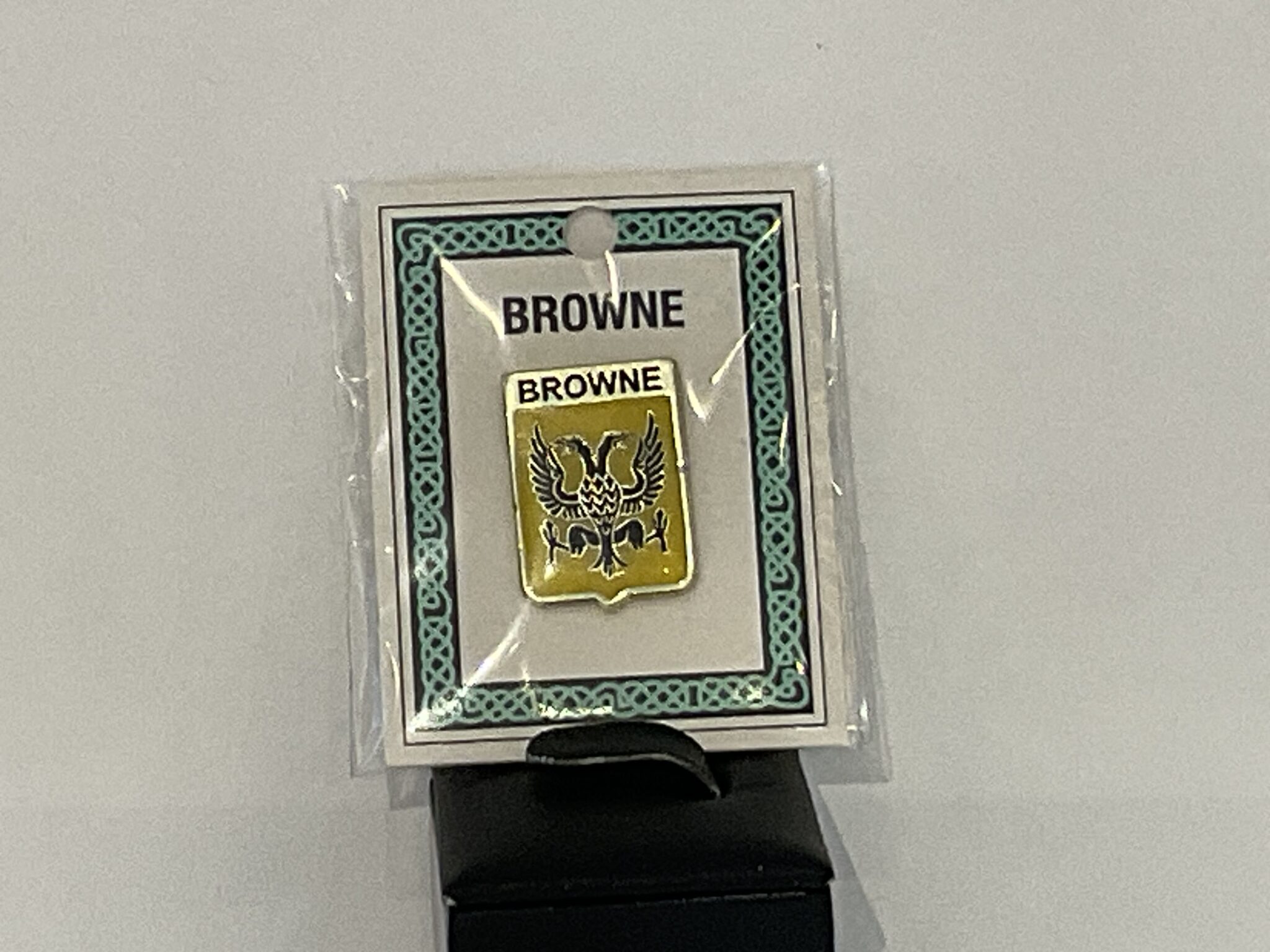 The Browne Pinbadge doesn’t fit your family heritage? No problem! We carry a wide variety of family crests in pinbadges, keychains, coasters, and more. Feel free to contact the store if you do  not see your family available.
