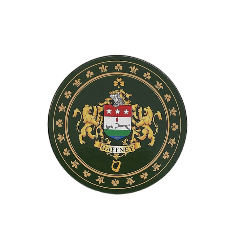 The Gaffney Coaster is a proper item to celebrate your clann while enjoying a pint (or anything cold)! Backed with cork, the coaster itself work just like any other coaster would, but is embellished with your family name! The Gaffney Coaster is the perfect Irish addition to your home or bar.