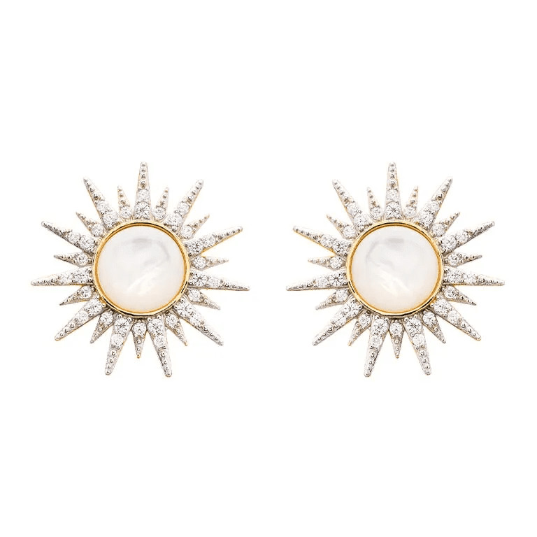 These beautiful sun earrings in 14k Gold Vermeil are just beaming.   Glowing and radiant they represent energy and life force, with touches of light and warmth.  The center stone is Mother of Pearl which depicts inner purity and the white Cubic Zirconia stones represent hope and renewal energy.   These stunning sun earrings will make a beautiful gift for many different occasions.