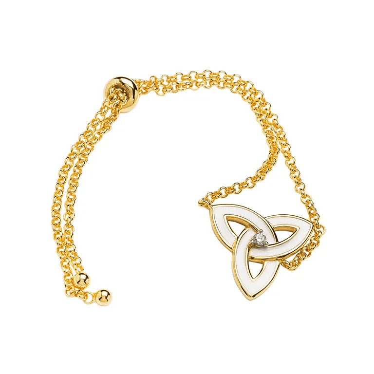 The Gold Vermeil Trinity Enamel Bracelet effortlessly blends tradition and fashion. Featuring brilliant 14kt gold vermeil and modern-day enamel, sealed with a cubic zirconia, this bracelet is sure to impress. The trinity knot is an iconic symbol in Ireland. Over the years, the meaning of it has been given many different interpretations. The symbol of everlasting love (thanks to its “eternal” knotwork), or the connection between present, past, and future are merely a couple. The combination of the symbolism and materials is stunning, making a lovely gift for any occasion.