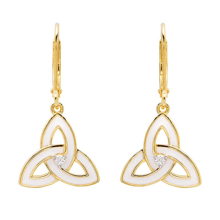 The Gold Vermeil Trinity Enamel Drop Earrings effortlessly blend tradition and fashion. Featuring brilliant 14kt gold vermeil and modern-day enamel, sealed with a cubic zirconia, these earrings are sure to impress. The trinity knot is an iconic symbol in Ireland. Over the years, the meaning of it has been given many different interpretations. The symbol of everlasting love (thanks to its “eternal” knotwork), or the connection between present, past, and future are merely a couple. The combination of the symbolism and materials is stunning, making a lovely gift for any occasion.