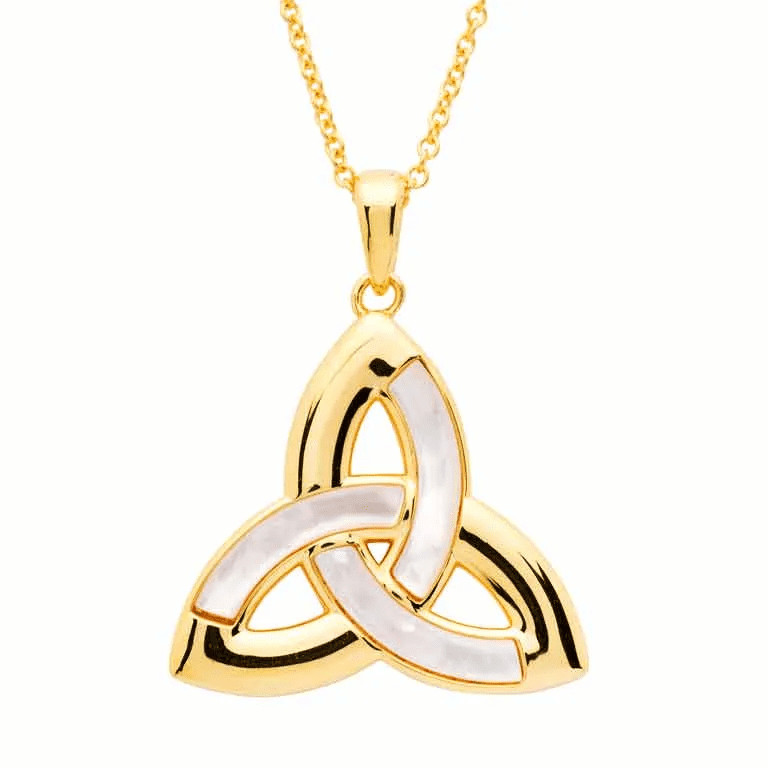 The Gold Vermeil Trinity and Pearl Necklace effortlessly blends tradition and fashion. Featuring brilliant 14kt gold vermeil and mother of pearl, this necklace is sure to impress. Mother of pearl is an organic substance from the lining of mollusk shells, bringing the wearer positive energy and abundance. The trinity knot is an iconic symbol in Ireland. Over the years, the meaning of it has been given many different interpretations. The symbol of everlasting love (thanks to its “eternal” knotwork), or the connection between present, past, and future are merely a couple. The combination of the symbolism and two materials is stunning, making a lovely gift for any occasion.