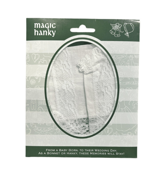 The Magic Hanky is an Irish Linen Hanky made into a baby’s hat. It can be converted back into a hanky for a bride on her wedding day.