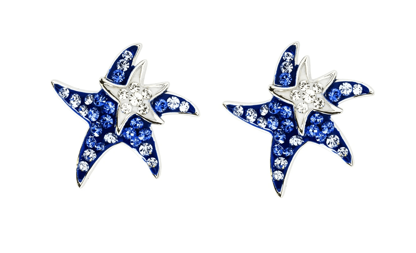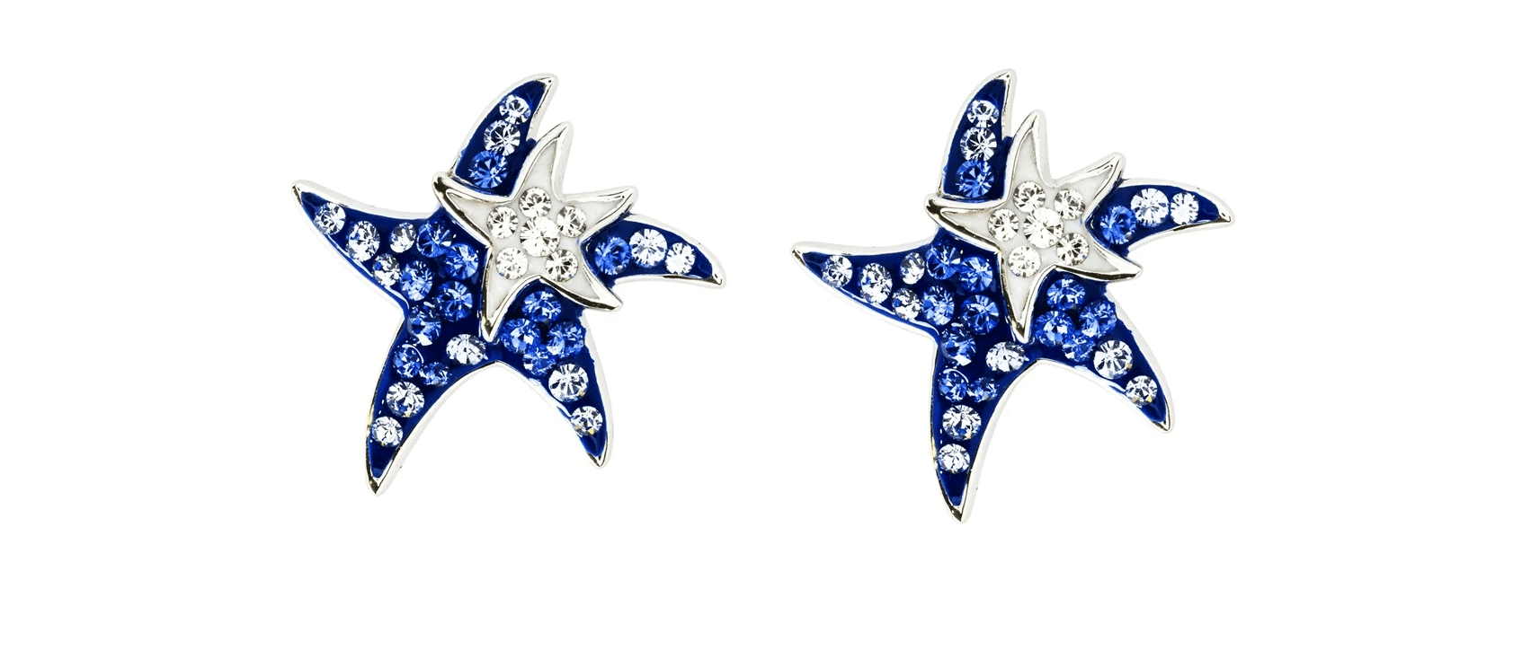The Mom and Baby Starfish Earrings show a larger starfish with a smaller one on top, with carefully placed contrasting crystals. These earrings are the perfect gift for any and all ocean lovers, mother or daughter.