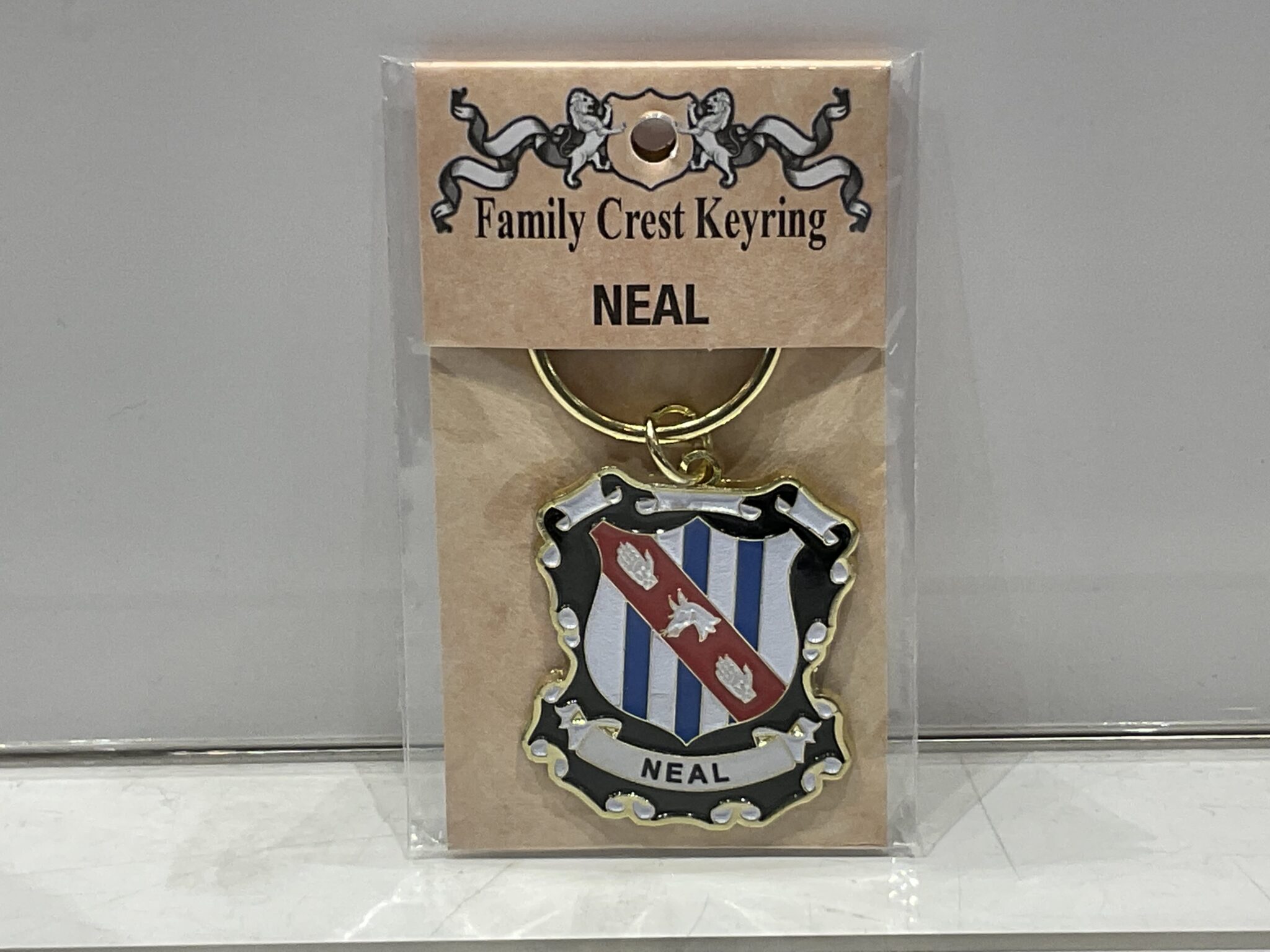 The Neal Keyring doesn’t fit your family heritage? No problem! We carry a wide variety of family crests in pinbadges, keychains, coasters, and more. Feel free to contact the store if you do not see your family available.