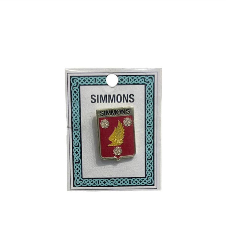 The Simmons Pinbadge doesn’t fit your family heritage? No problem! We carry a wide variety of family crests in pinbadges, keychains, coasters, and more. Feel free to contact the store if you do  not see your family available.