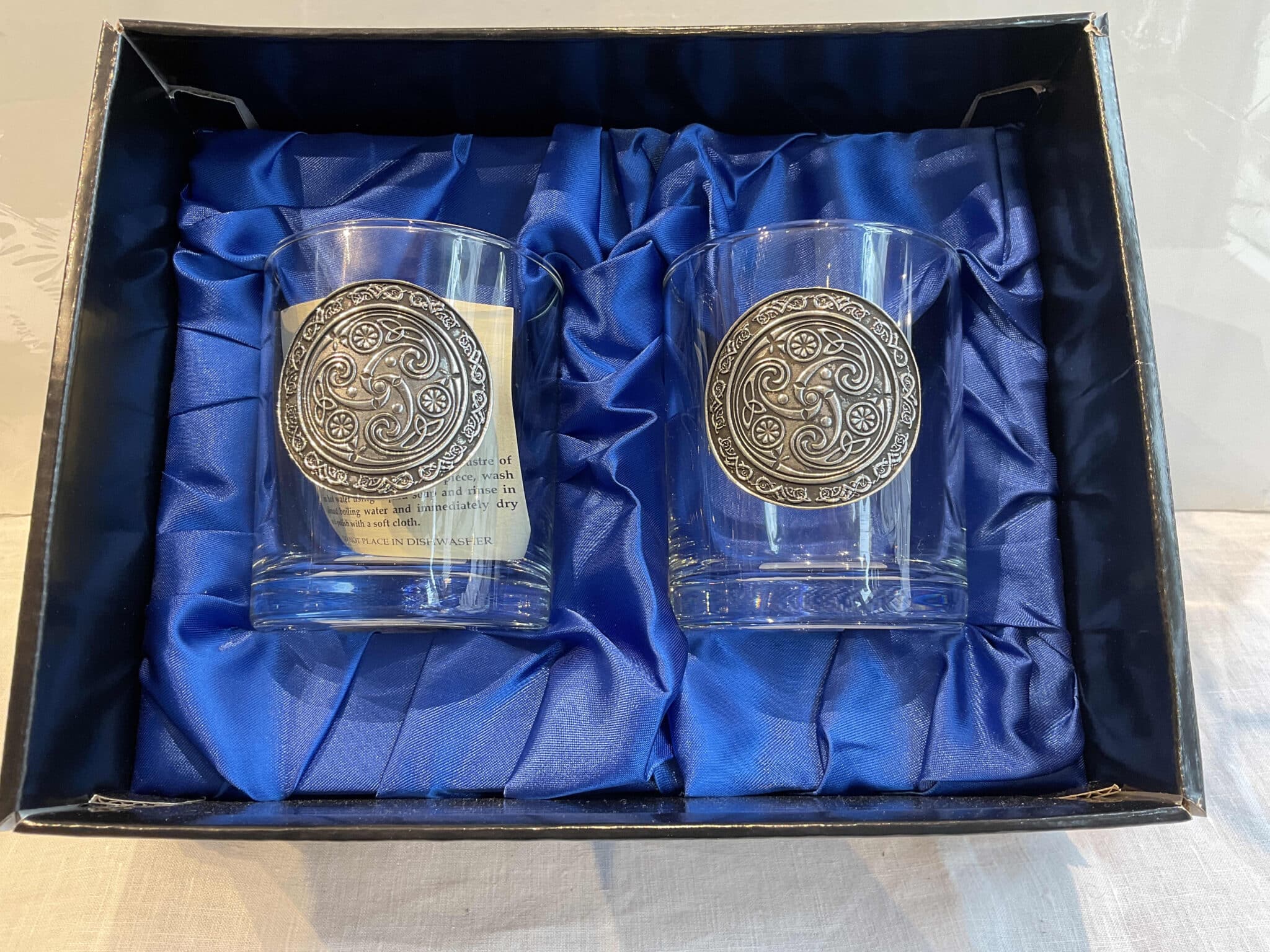 Unwind from a hard day of work in Celtic style with a taste of whiskey from this Mullingar Pewter Whiskey Triskel Glass Set. These clear, sleek glasses each adorned on the front with a pewter disc with an antique finish that gives this glass a vintage look. Featured on each disc a circle made of 4 intricate Trinity knots. Trinity knots each feature 3 loops that symbolize the presence of the number 3. The Celts held the number 3 sacred, in life and nature. With a volume capacity of approximately 6 fluid ounces, this set includes 2 glasses. Also, comes packaged in an elegant gift box with a beautiful blue satin insert. Make this glass set a wonderful gift for friends or family!